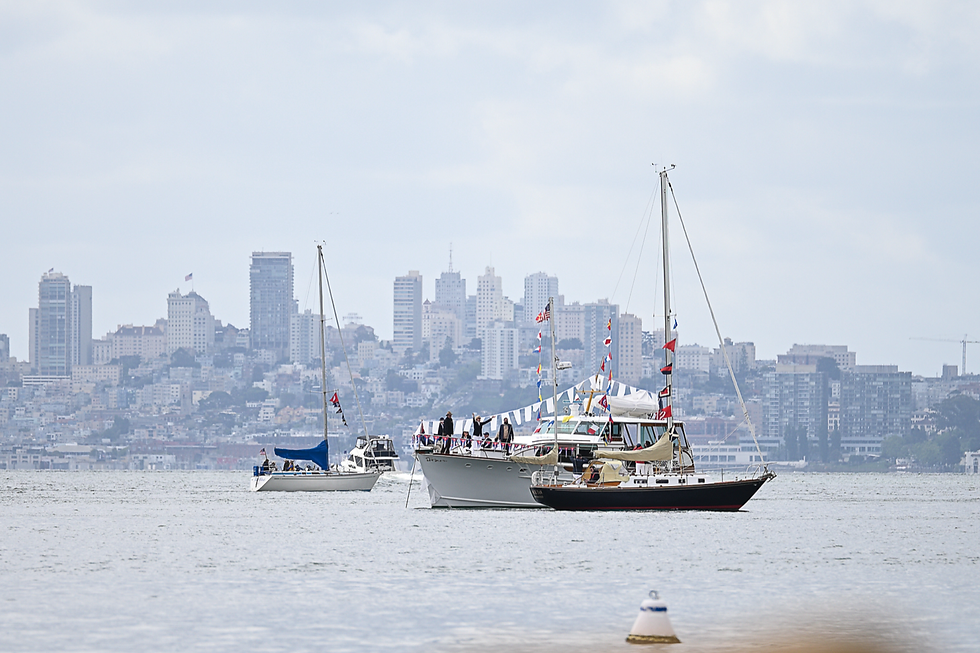 The ‘God Squad’ aboard the Aurora V, the Corinthian Yacht Club’s vessel, blesses boats in Racoon Strait during the Blessing of the Fleet on April 26 hosted by the Corinthian Yacht Club in Belvedere as part of the 109th annual Opening Day on the Bay marking the start of the boating season. The tradition dates to 1963 and is modeled after blessings for working fishing fleets. (Leo Leung / For The Ark)